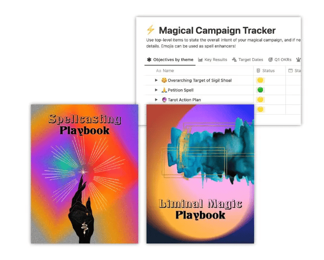 Throughout the lessons, you’ll find useful extras 👉 a printable Spellcasting Playbook, Liminal Magic Playbook, and a free Notion template to help you track your magical campaigns!